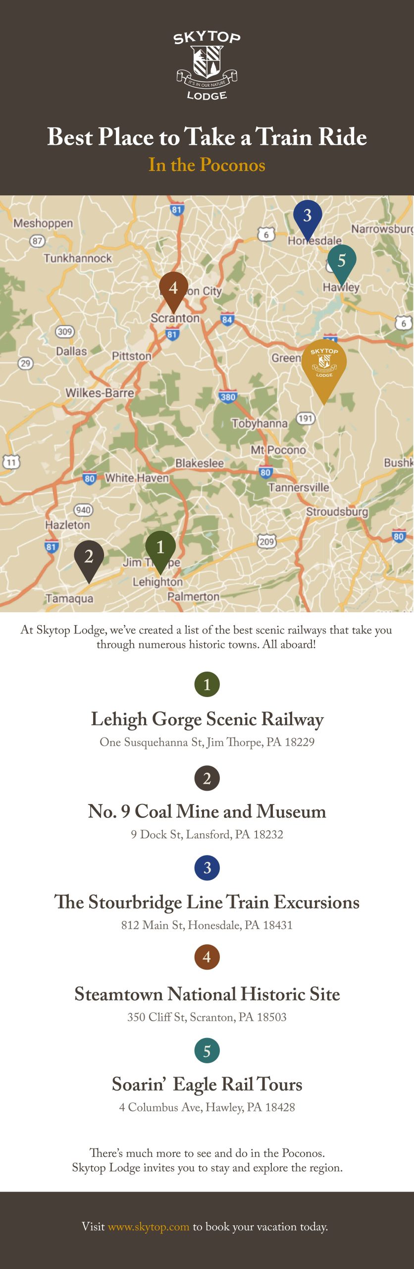 There are several ways to see the Poconos from a railcar. Below is a list of the best scenic railways that take you through numerous historic towns.